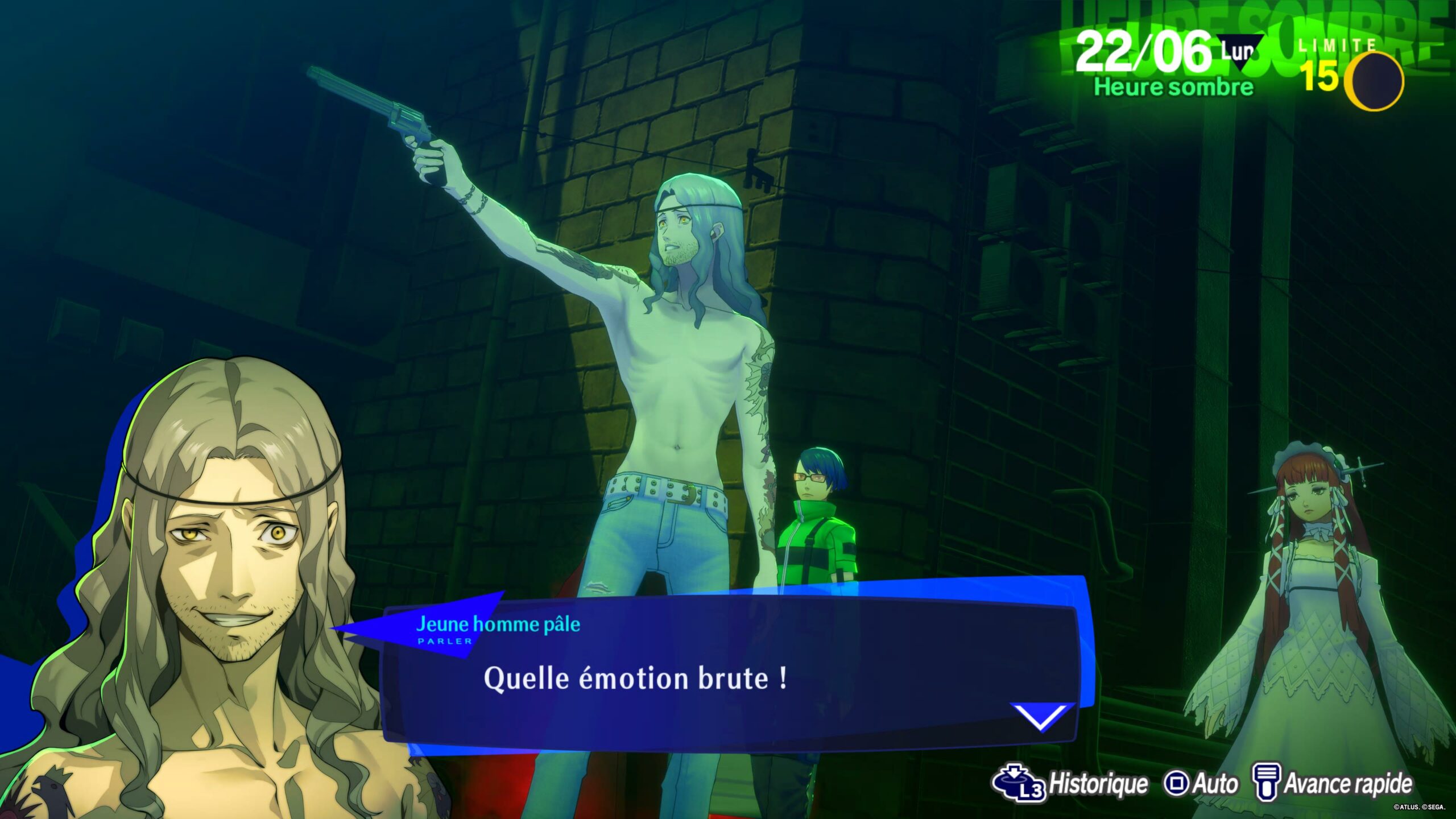 Un Persona, donc. Mais un qui pourrait choquer pour quiconque prend la série en cours de route. Non pas parce qu'il faut avoir connaissance des deux – trois, en vrai et a grand minima, mais ne compliquons pas les choses – précédents épisodes, mais parce qu'il est bien plus sombre que ce que nous ont présenté Persona 4 et 5 par la suite. L'atmosphère du jeu est plus lourde, empreinte de désespoir, et observer pour la première fois les lycéens invoquer leurs Persona a ce petit quelque chose de saisissant alors qu'ils pointent un pistolet sur leurs têtes avant qu'une explosion ne résonne. On est loin des clichés guimauves associés au JRPG.