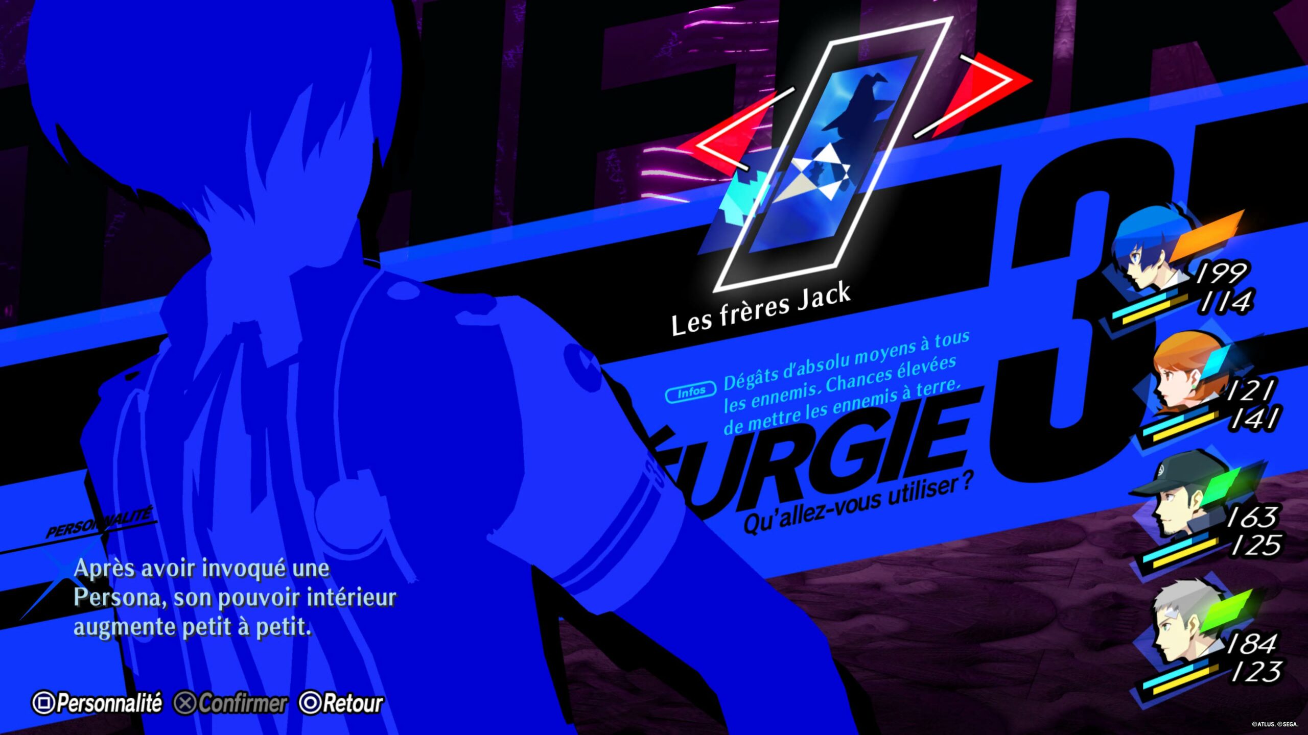 Atlus a ajouté à son RPG au tour par tour la possibilité d'offrir son "one more", son tour bonus gagné après avoir profité d'une faiblesse d'un monstre, à l'un de ses coéquipiers plutôt que de le conserver pour soi. Il a également modifié la mécanique des cartes de tarots : auparavant de simples bonus aléatoires en fin de combat, ils peuvent être choisis avec précision désormais. Et vous pouvez également additionner des cartes d'arcanes offrant de nombreux bonus – notamment en gain d'expérience – sur une expédition. Surtout, surtout, s'est greffé au système de jeu la Théurgie, des super attaques que chaque personnage charge au prix d'actions précises à réaliser en combat – soigner ses alliés, faire des coups critiques – qui sont aussi simples à garder en stock qu'à remplir.