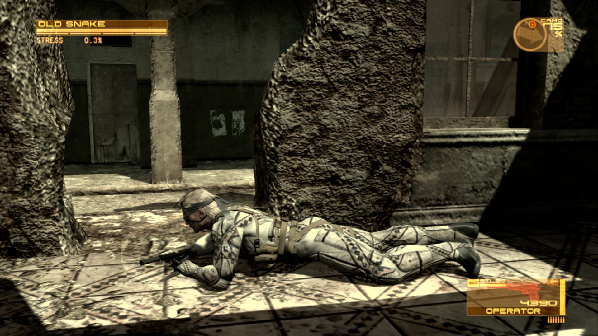"Sense" est un peu plus littéral, au point que j'ai pu le reconnaître dès que le jeu m'a laissé le contrôle d'Old Snake. Le radar d'époque se retrouve affublé d'un nouveau cercle permettant de ressentir les sons environnants, qui viennent une nouvelle fois influencer l'infiltration que propose le titre. Et alors que je passe discrètement à côté des soldats mitraillettes en main, dotés de cerveaux bien plus "jeu vidéo" que "véritable conflit armé", je ne peux m'empêcher de penser à quel point tout cela ressemble à une belle métaphore de l'état du jeu vidéo de cette époque.