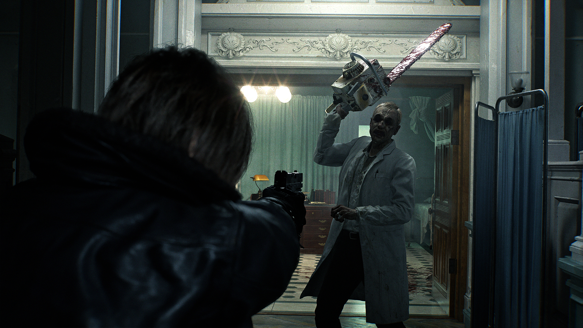 Aux commandes de Leon tout change, mais rien ne change. Manette en main, on retrouve nous, nos marques, comme si on venait de quitter RE4 Remake. Finitions à la hache, coups de pieds rotatifs de super-flic entraîné… Les clins d'œil démarrent déjà, et si les clichés s’enchaînent, ils le font en renouvelant leur propre mythologie : et si on utilisait une tronçonneuse contre un zombie lui aussi armé d’une tronçonneuse ? Alors oui, c'est moins crédible ici au cœur d'un hôpital privé New-yorkais que dans un petit village rural espagnol, mais passons… Leon retrouve Grace, le scénario avance. Tout s’enchaîne à 100 à l’heure, le passage de l’un à l’autre est justifié, fluide, presque invisible. On se dit qu'on a de l'or entre les mains.