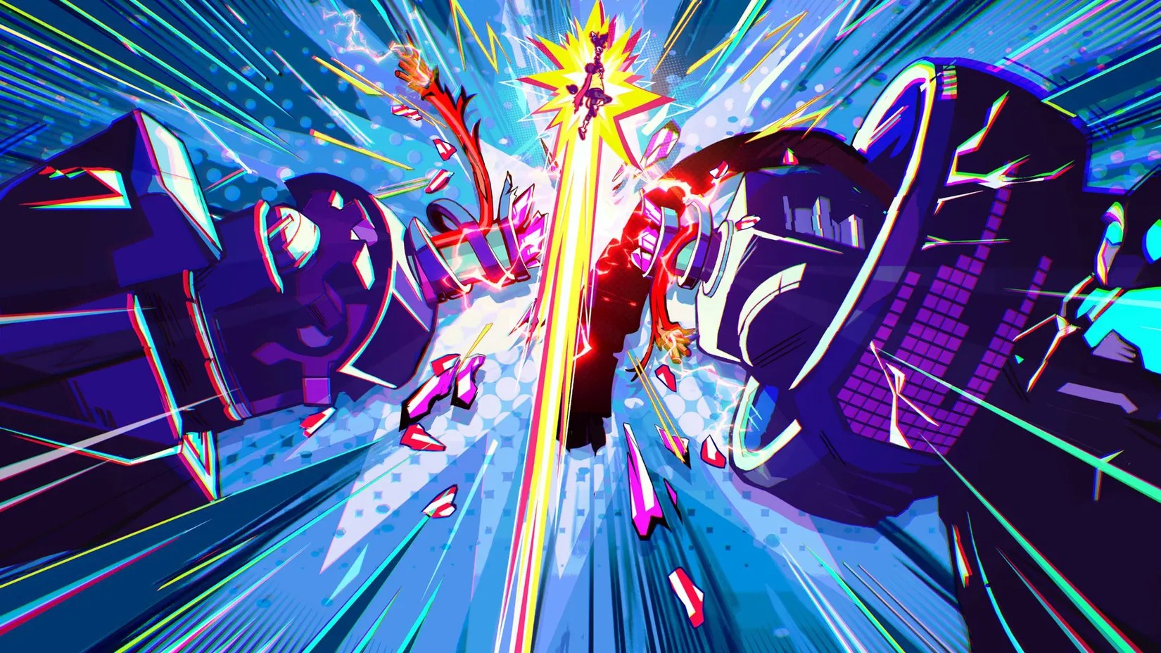 Mais les ponts sont multiples, mélangés à dessein pour trouver une nouvelle saveur. Les sprites 2D traditionnels prennent vie soudainement dans une séquence animée explosive et viscérale qui vient faire des clins d'œil à la réalisation de Trigger dans Promare, avant de passer à des séquences in-game dont la réalisation rappelle – de l'aveu des créateurs d'ailleurs – la caméra ultra dynamique d'un Edgar Wright. Des inserts çà et là jouent autant l'ultra-référence à Jojo's Bizarre Adventure qu'au catch américain.