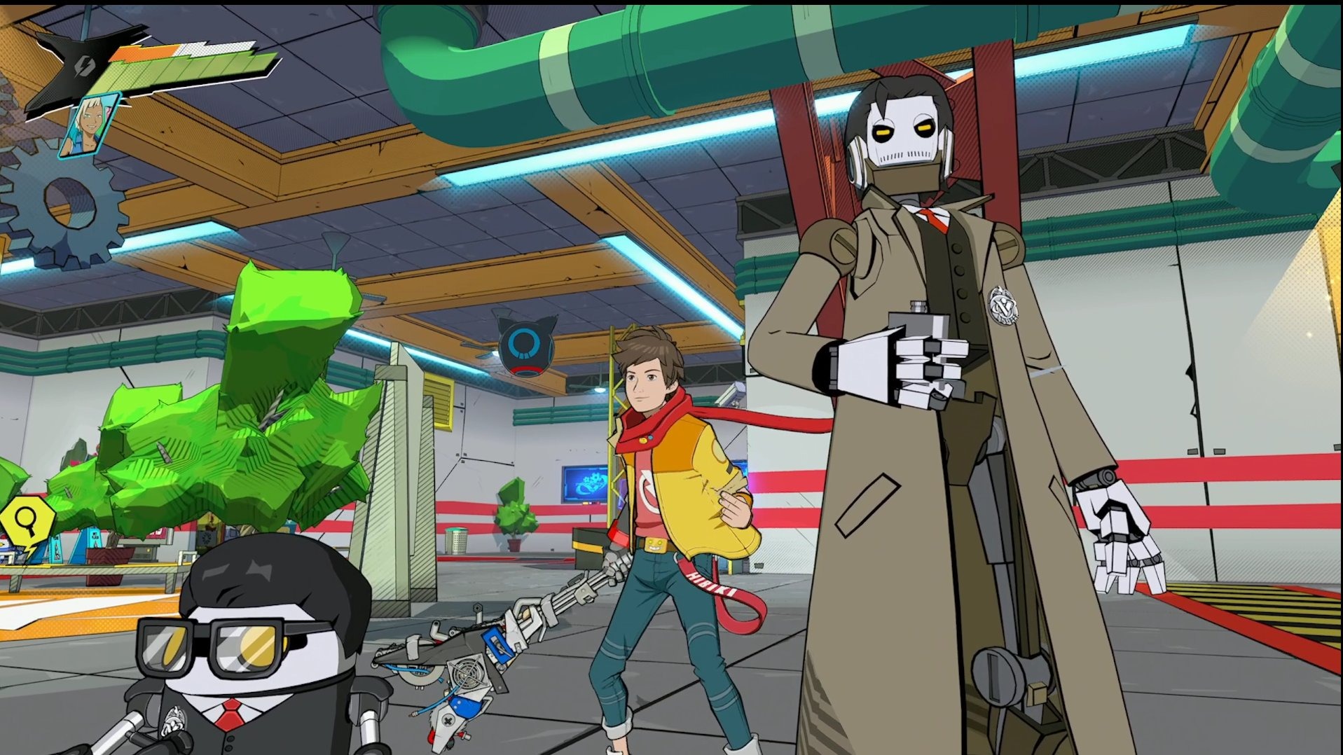 Hi-Fi Rush, c'est quoi ? C'est d'abord, comme tous ces jeux cités précédemment, un retour des couleurs pétantes dans notre univers vidéoludique. Graphiquement, le titre sorti de l'esprit du game designer John Johanas peut clairement se revendiquer de cette époque où le cel-shading a tout conquis sur son passage. Il serait cependant réducteur de constamment le comparer à cette tendance lointaine puisque son inspiration graphique est d'une mixité folle. On peut autant y voir des tendances graphiques des animés modernes, par exemple dans la manière dont les yeux de ses personnages principaux sont représentés, que de grosses influences américaines, dans la façon dont les animations s'activent sur une rythmique plus Pixar-ienne que Ghibli-isante.