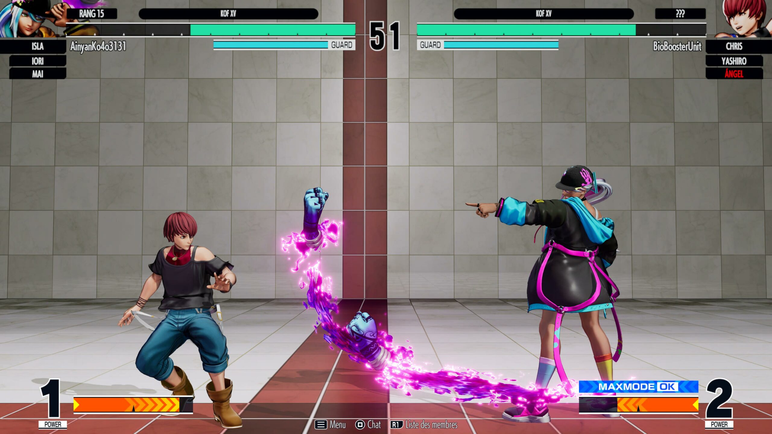 Reste qu'au-delà de cette excellente nouvelle, tout est assez sommaire, à commencer par les temps de chargement qu'on aurait aimé voir plus optimisés sur les nouvelles consoles. Un écran noir de deux secondes pour seulement changer un combattant du terrain entre chaque round, c'est tout de même limite. Bien sûr, on a ce que l'on demande d'un jeu de combat en 2022 : pouvoir créer des lobbys avec un mode spectateur, un classement en ligne, des matchs en FT2 qui se finissent sur la possibilité de créer automatiquement un salon pour continuer à se mettre sur la tronche joyeusement. Là-dessus, pas de souci. Mais qu'en est-il pour ceux qui veulent faire de The King of Fighters XV leur tout premier KOF pris sérieusement ? On a d'abord un mode tutoriel, qui est simplement une succession de petits défis pour montrer les possibilités du gameplay du jeu. C'est ici qu'on apprendra les petits sauts, grands sauts, roulades, annulation de gardes et le MAX Mode. Mais tout n'est que pointé du doigt, sans jamais véritablement mettre le joueur en situation.