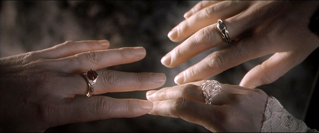 Vous l’aurez peut-être compris, sous les traits charmants d’Annatar, Sauron est de retour, prêt à jouer un mauvais tour : dans les flammes de la Montagne du Destin, il forge seul et en secret un Anneau Unique destiné à asservir les porteurs des autres anneaux. Heureusement, dans un sursaut de jugeote, Celebrimbor avait lui aussi forgé seul et en secret d’autres anneaux. Trois plus exactement. Trois anneaux pour les elfes. Trois anneaux particulièrement puissants : celui du feu, de l’air et de l’eau. Lorsque Annatar/Sauron enfile l’Anneau Unique, il est révélé aux seigneurs elfes. Ceux-ci retirent instantanément leurs anneaux qui ne seront pas corrompus par l’unique.